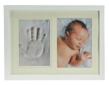 Een witte aluminium fotolijst Star geschikt voor een foto 13 x 18 cm, speciaal voor Uw babyfoto met daarnaast de afdruk van een handje en een voetje. Kortom een sfeervolle fotolijst voor de eerste babyfoto