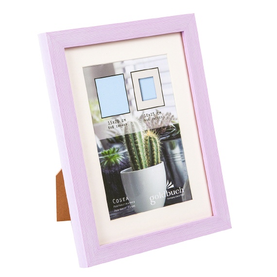Mooie licht paarse GOLDBUCH fotolijst COSEA, een degelijke kunststoffen portretlijst met een 16mm smal profiel met houtstructuur. Deze lijst is geschikt voor 1 foto in de maat 15x20 cm of als je het passepartout gebruikt een 10x15 cm foto. De GOLDBUCH fotolijst is voorzien van een staander zodat de lijst ook kan staan. Ook is het mogelijk de lijst te hangen, zie foto's voor de haakjes.
